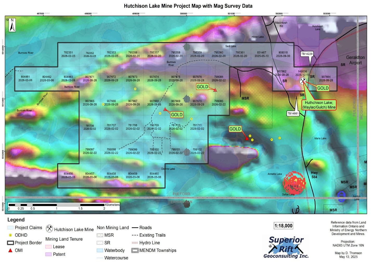 We have identified many high-grade areas of interest that will need follow-up, including the workings of the historic Hutchison Gold Mine and many other gold showings covering the western area of the property, indicating a gold trend for a strike length of about 2.5 kilometres.