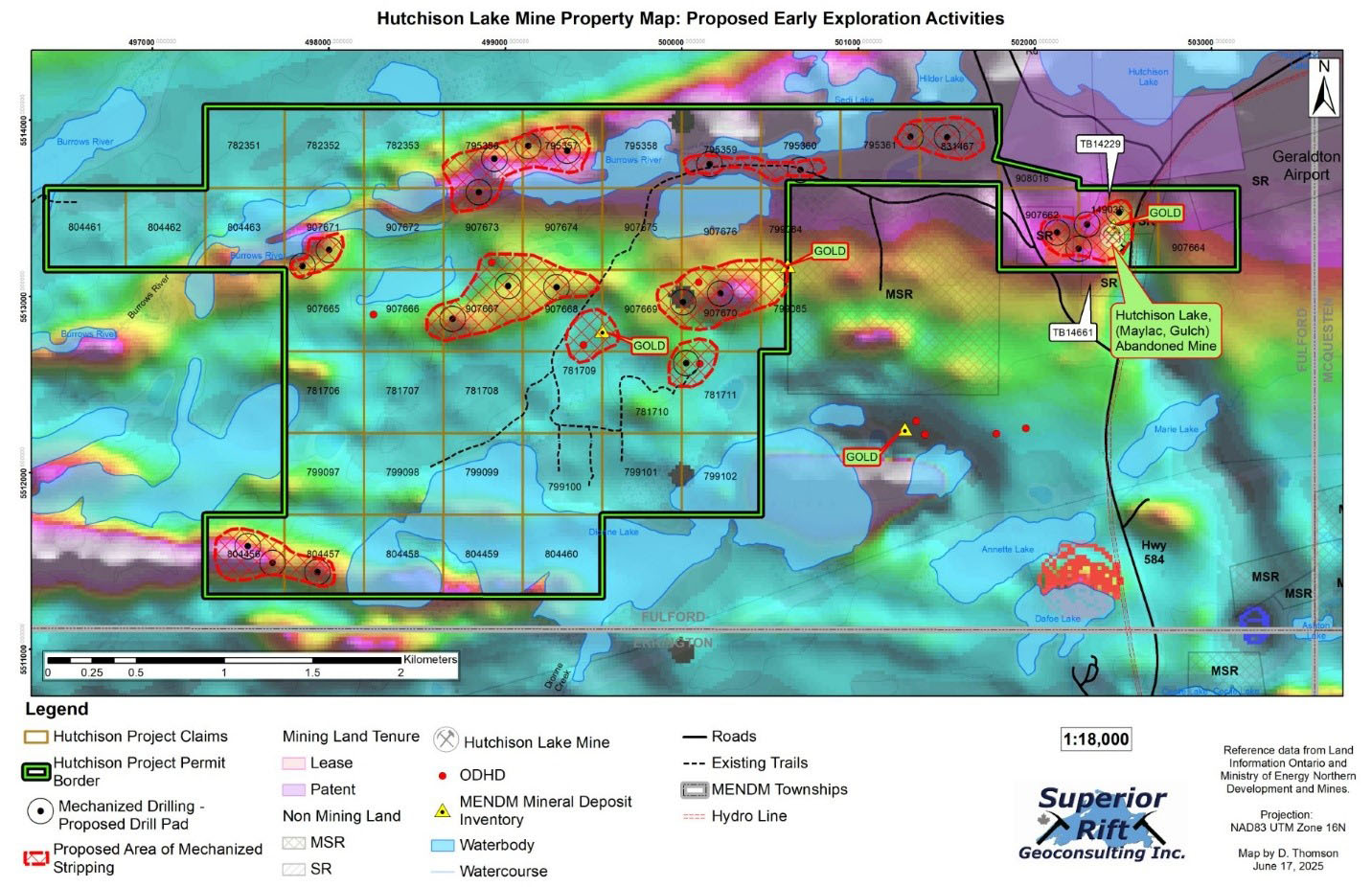 We have identified many high-grade areas of interest that will need follow-up, including the workings of the historic Hutchison Gold Mine and many other gold showings covering the western area of the property, indicating a gold trend for a strike length of about 2.5 kilometres.